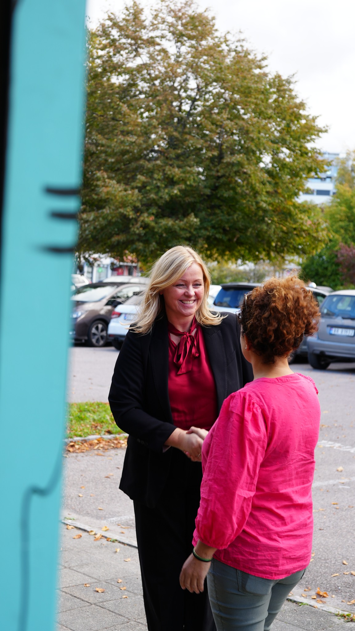 Arbeids- og inkluderingsminister Kjersti Stenseng hilser på programleder for Områdesatsing Fredrikstad, Christine Frantzen.