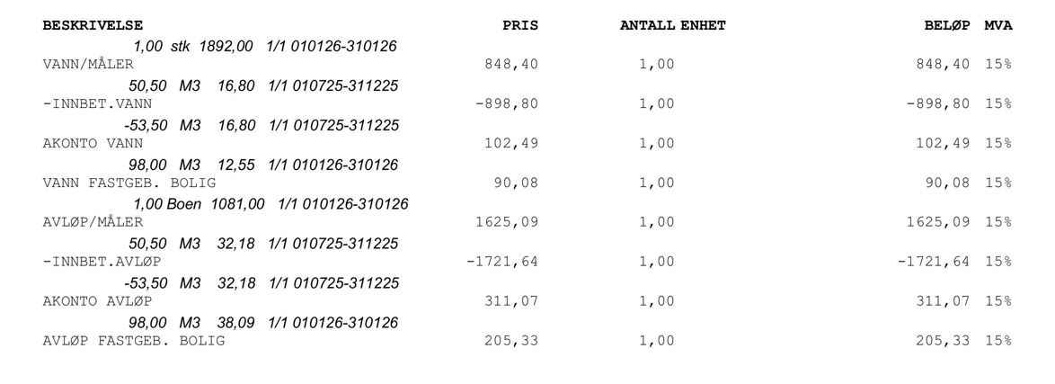 - Vann/måler: forbruk 2025 målt etter avlesning av vannmåleren i 2025-priser