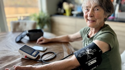 I stedet for at hjemmesykepleien kommer hjem til Kirsten Tveter (79) fire ganger om dagen, tar hun blodtrykket og sender inn resultatene selv. – Det er trygghet i en eske, sier hun om utstyret som sørger for at kommunen kan følge opp pasientene digitalt hjemme.
